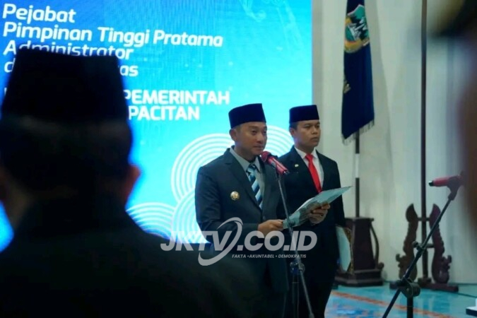 PACITAN | JKTV.co.id – Bupati Pacitan Indrata Nur Bayuaji kembali melantik pejabat lingkup Pemerintah Kabupaten Pacitan. Sebanyak 79 pejabat diambil sumpahnya terdiri dari jabatan tinggi pratama, jabatan administrator dan pengawas. Pelantikan sendiri berlangsung di Pendopo Kabupaten Pacitan, Kamis (15/1) malam.