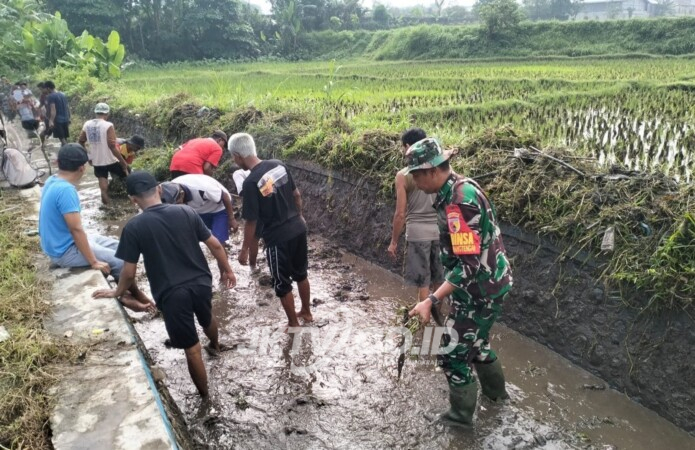 Sertu Robert bersama anggota Kelompok Tani Sido Makmur turun langsung, menyingsingkan lengan baju, bekerja tanpa sekat. Tangan-tangan mereka bergerak serempak, mengangkat lumpur, memotong rumput liar, dan membuka jalur air yang sempat tersumbat.