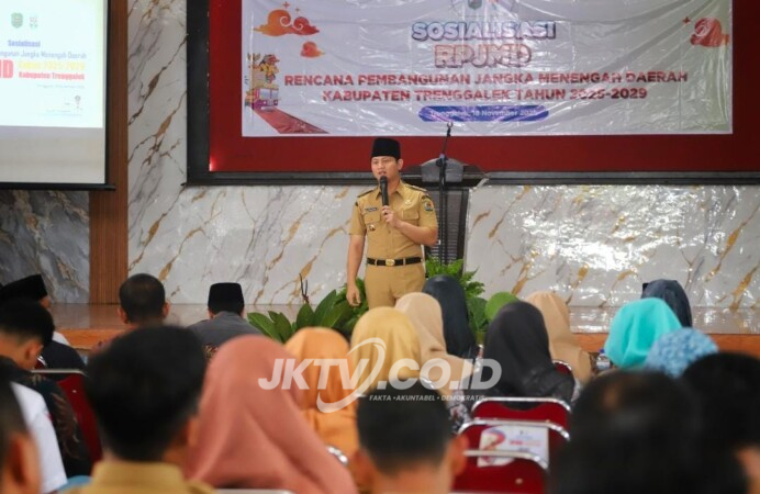 TRENGGALEK I jktv.co.id – Bupati Trenggalek, Mochamad Nur Arifin sosialisasikan visi misi pembangunan RPJMD Kabupaten Trenggalek tahun 2025-2029 di Gedung Serbaguna, Desa Sumberbening, Kecamatan Dongko, Selasa (18/11/2025).