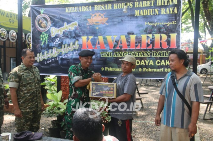 MADIUN I jktv.co.id – Prajurit Korps Kavaleri TNI AD di Madiun Raya memberikan bansos kepada masyarakat kurang mampu pada acara peringatan HUT ke-76 Kavaleri TNI AD sekaligus Halalbihal yang digelar di Ngrowo Bening Edu Park, Kota Madiun, Rabu (15/6/2026). Para prajurit tersebut berasal dari berbagai satuan di jajaran Korem 081/DSJ dan Secata Rindam V/Brawijaya.