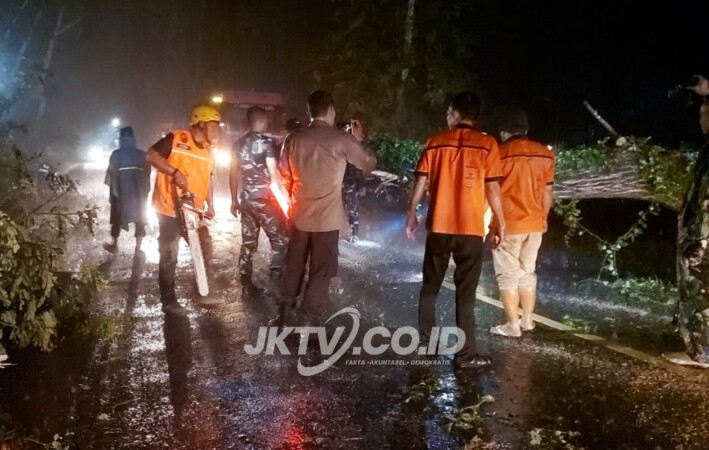 “Hujan disertai angin sejak sore turun terus mengakibatkan pohon trembesi ini tumbang dan menutup jalan,” kata Babinsa Koramil 0806/03 Durenan Koptu Roni di lokasi.